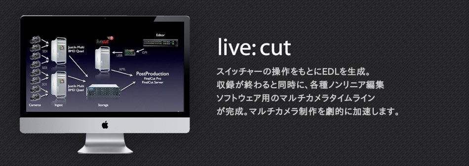 「live:cut」(ライブカット)はインジェストとメタデータ、ライブ収録中の同時ロギング、メディアマネージメントとFCPワークフローとの統合の すべてを、単一で使いやすいインターフェイスのツールにまとめたライブ制作ツールです。再編集とポストプロダクション作業を収録と同時並行して実行するこ とができる「live:cut」はテープのキャプチャとフッテージのロギングは過去のものとなります。