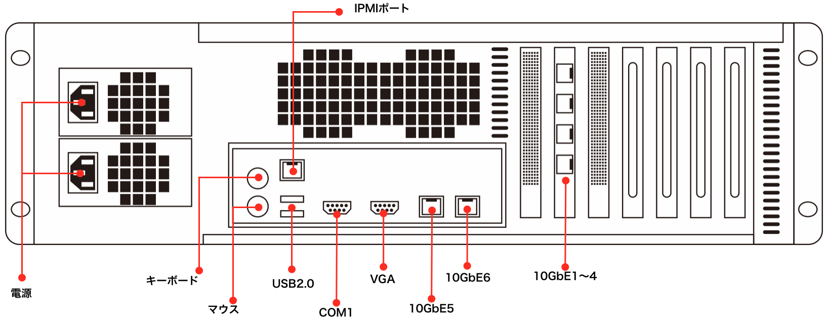 10ギガビットイーサネット(RJ45)ポート x 6 *オプションで4ポートをSFP+に変更可能 |
