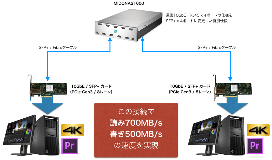 4K編集に対応するためMIDONASにあえて2式の編集クライアントの接続に限定し、データアクセスの効率化と速度安定化のためにSFP+接続に変更したシステム事例です。この構成では図にありますように読み書き速度を高速にできるため、従来であれば直接接続する6~8ドライブのディスクアレイでしか得られなかったアクセス速度をNAS環境にて達成しています