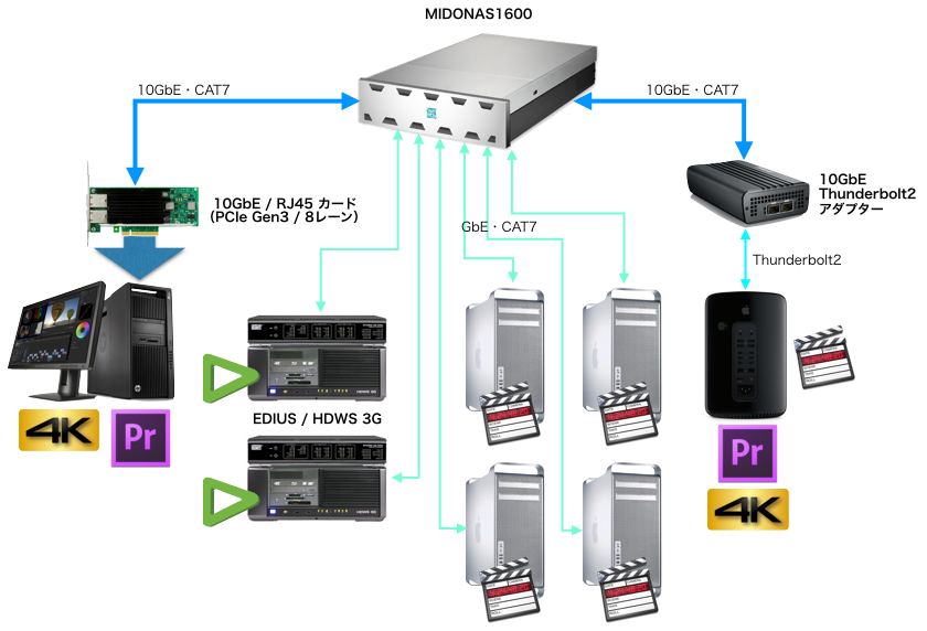 既存の旧型MacProによるFinalCutPro7とEDIUSのHD編集環境を維持しつつ、4K編集の環境を追加した環境です。MIDONASは標準仕様で10ギガビットイーサネットを6ポート持っていますが、そのうちの4ポートをギガビットイーサネット6ポートへ変更することがオプションで可能です。このオプションでアレンジしこの環境は完成しています。10ギガビットはRJ45による接続ですがそれぞれ450~500メガバイトの速度を発揮していますのでXAVCコーデックによる4K編集には十分に対応しています。またFinalCutPro7は共有ドライブに対して独特のアクセスをしますので、各マシンに専用オプションであるそれに対応したユーティリティーをインストールを行っています。