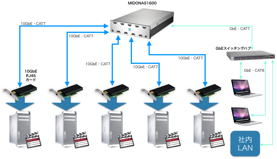旧型MacPro(MacPro5.1)によるFinalCutPro7編集環境を生かし、既存の社内LAN経由でのアクセスを可能にした事例です。この場合のアクセス速度はMIDONAS1600の総合的な速度が約1800メガバイト毎秒ですので各MacProあたり300~330メガバイト毎秒の速度が得られますので、使用目的であるHD編集をProRes422コーデックで行うことに余裕を持って対応することができます。社内LANからのアクセスは主に素材データのプレビューとなるためスイッチングHUBとはギガビットイーサネットで接続しています。主に地上波オンエアの番組制作に活用いただいています。